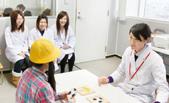 本学科では、3年次に実施する臨地実習の事前基礎実習として、実際に言語障害を患っている小児や高齢者の方々と接する機会を設けています。校内において現場を想定した環境を経験することで、3年次の臨地実習では、より質の高い知識や技術、対応スキルを身に付けることができます。